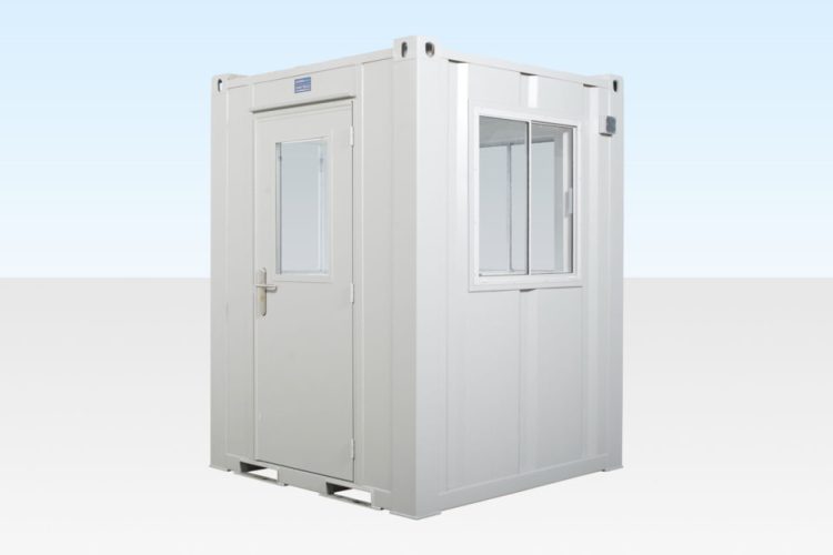 A robust guard hut typically used by a single security officer, fitted windows on three sides and a door with window to allow 360 degrees vision.